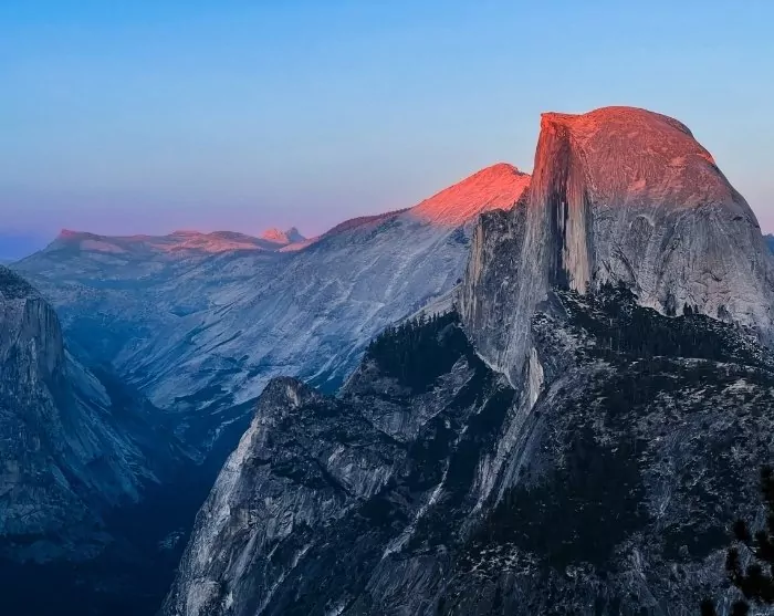 I sommermånederne, når sneen er smeltet, er Glacier Point ét af de udsigtspunkter, du ikke må snyde dig selv for. Du kan både køre herop i bil, og du kan også booke en bustur hertil (bookes direkte i parken efter først-til-mølle-princip). Har du mod på en vandretur fra udsigtspunktet, kan du også tage en shuttle op og vandre via Four-Mile-Trail ned. Fra Glacier Point finder du også en solnedgang af de helt særlige – nemlig dét øjeblik, hvor solen kaster et orange skær på det store bjerg, Half Dome.