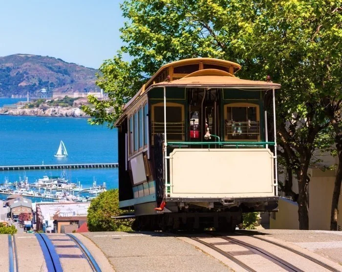 Du kan købe enten enkelt- eller heldagsbillet ved vendestationerne, og med den berømte Hyde-Powell linje kommer du nemt til/fra Union Square og det berømte område, Fisherman’s Wharf. Skal du gøre det på ægte San Fran-manér, så se om du ikke kan få en ståplads på siden af vognen og mærke suset i maven, når der kommer lidt ekstra fart på vej ned ad bakkerne.