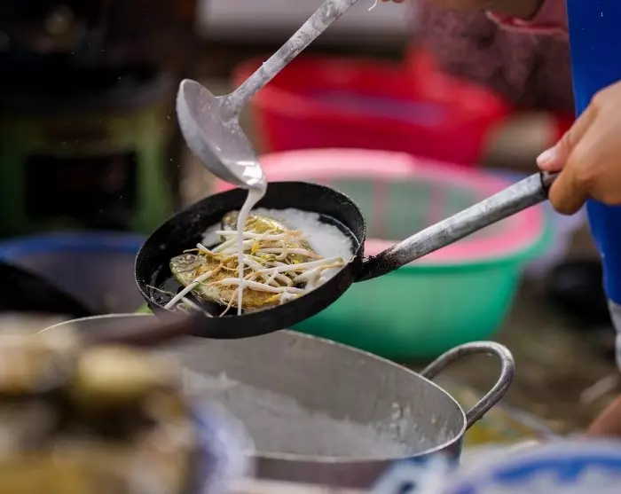 Tilbage i cyclo’en køres du ad små, snoede gader inden for citadellets mure til det næste spisested. Her oplever du, hvordan man laver ”banh khoai”, som er en lækker og sprødstegt pandekage lavet på rismel og gurkemeje, hvilket giver den en karakteristisk gul farve. Pandekagen fyldes typisk med svinekød, rejer, bønnespirer og nogle gange svampe. Top den gerne selv med friske urter for en eventyrlig smagsoplevelse. Prøv også specialiteten ”nem lui”, som er grillet svinekød på citrongræsspyd. Pak kødet ind i rispapir og top det med friske urter og grøntsager. Dyp det herefter i peanutsauce. Mums!