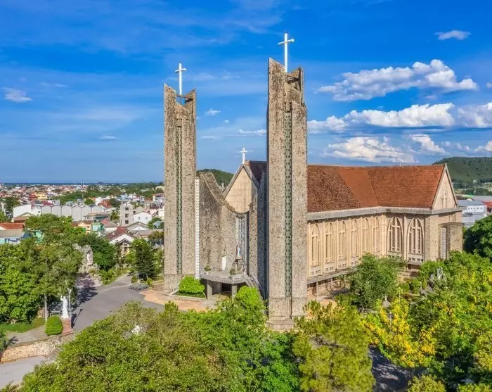 Turen fortsætter til Phu Cam-katedralen, som er en betydningsfuld katolsk kirke, der er kendt for sin imponerende arkitektur, der kombinerer moderne design med traditionelle elementer. Bygget på en forhøjning med udsigt over Hué, præsenterer Phu Cam-katedralen en storslået facade med to høje tårne, der strækker sig mod himlen. Katedralen er et centralt samlingspunkt for det katolske samfund i Hué og står som et vigtigt symbol på den kristne tilstedeværelse i regionen.