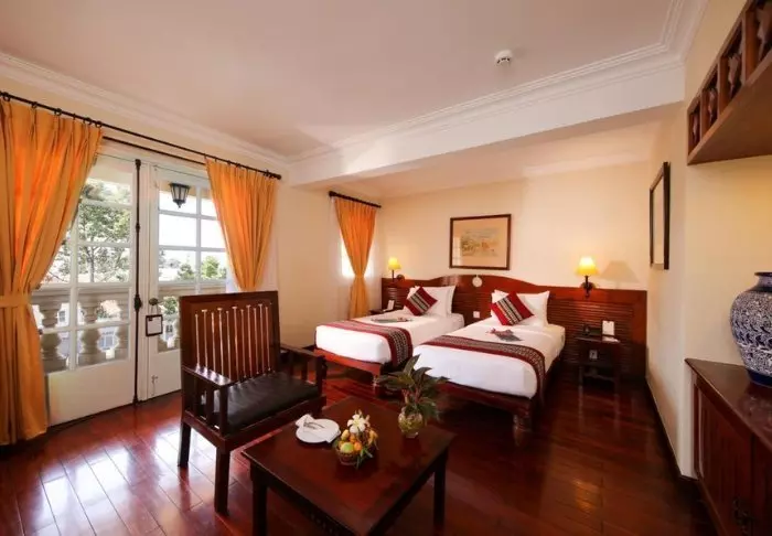 Du bor som udgangspunkt i et superior-værelse, der kombinerer moderne komfort med et strejf af vietnamesisk elegance. Værelserne er indrettet med store vinduer, der lukker dagslyset ind, samt trædetaljer og klassiske møbler, som skaber en varm og indbydende atmosfære. Særligt bemærkelsesværdige er vægpanelerne med blomstrende kirsebærgrene, der tilfører et lokalt og kunstnerisk udtryk. Alle værelser er udstyret med en dobbeltseng eller to enkeltsenge, køleskab, tv, værdiboks, elkedel, aircondition og eget badeværelse med toiletartikler og hårtørrer. De gennemtænkte detaljer giver en rolig base, hvor du nemt kan slappe af efter dagens oplevelser.
