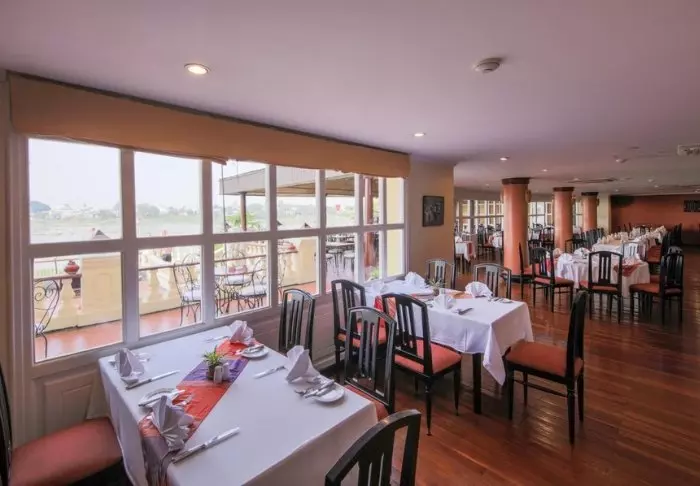Restaurantens menukort er baseret på lokale råvarer fra området og byder på traditionelle vietnamesiske retter med friske urter, fisk og frugt fra deltaet. Mange af ingredienserne kommer direkte fra hotellets egen have, og maden kan nydes med udsigt til floden, hvor solen langsomt går ned bag palmerne.